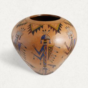 The Navajo are relatively recent arrivals to the Southwest. They probably migrated from the north in the 16th Century thereby becoming a part of the Pueblo IV period. The Navajo have made pottery since their arrival; possibly they brought pottery with them during their southern migration. They made a plain and decorated pottery. The plain being considered the older style. After the railroad's arrival to the Southwest in the 1880's, the Navajos reduced pottery production with the availability of commercially made utility ware at trading posts. Today's Navajo pottery differs little from the old styles. It is often pear-shaped, conically bottomed, and colored in a reddish brown. It is serviceable and made waterproof by coating with resin from pinon pine. Once the resin permeates the clay, the pot can be placed in hot coals with no loss of the resin or its sealing properties. Decorations are simple beading or applique. If the pot has the clay beads or fillets, a space or spirit break is included. It might appear as if the potter forgot to include one fillet. Anasazi culture potshards are ground and used as a tempering agent. the pot is built by coiling, shaped by hand with the aid of a corn cob and fired in an open pit. Wedding vases and other vase styles are common. The Navajo has been known to make large jars but more commonly the pots are under 12 inches in height. The large jars are considered rare. The Navajo people are probably the largest consumers of Navajo pottery. Therefore the Navajo potter makes pottery primarily for the Navajo trade. There is little collector demand at the present for the Navajo pottery. This is somewhat unfortunate as it represents a definite style and is traditional in all aspects. Recently, however, several Navajo potters have been exhibiting and marketing pottery with various designs. Appliqued decorations representing yucca, cactus, horned toads, animals, humans, and flowers are appearing on their modern pottery. These have more appeal to collectors.